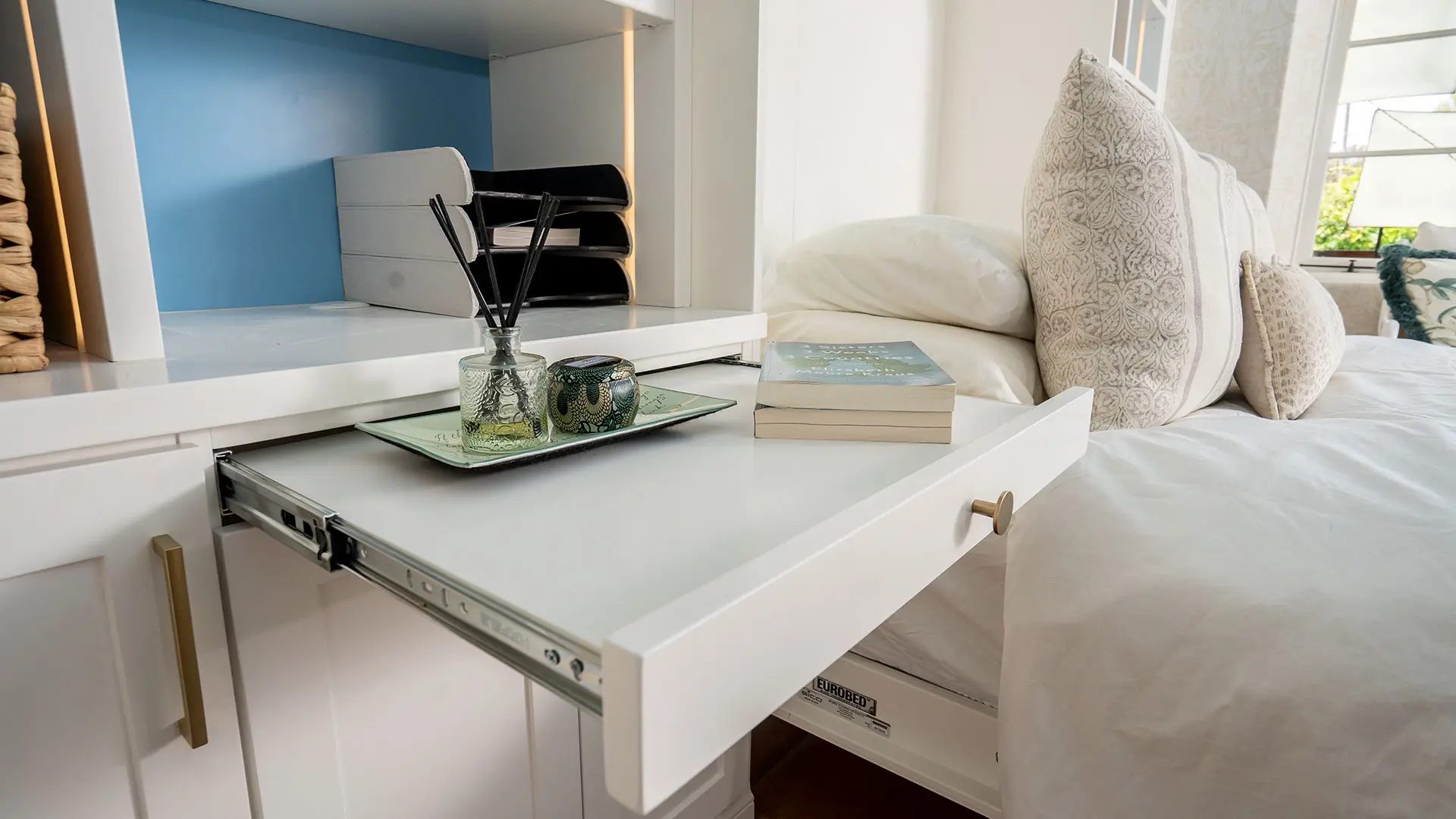 Add cabinets to your wall bed system for hanging, shoe storage, dressers, and laundry. Stay organized by adding stylish trays and drawers, or consider some of our special accessories that offer convenience by tucking them into the units for easy yet functional storage.